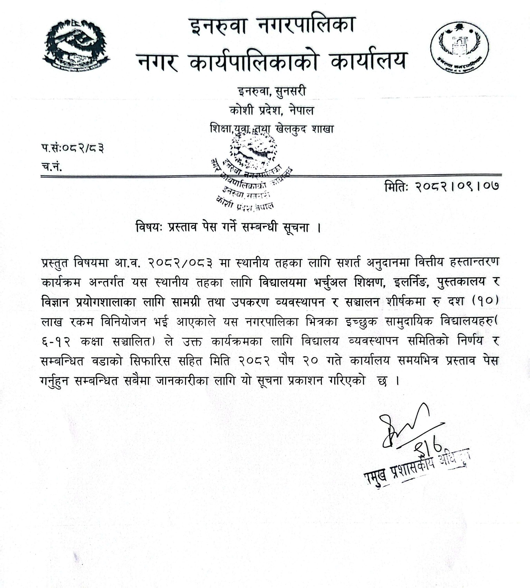 » प्रस्ताव पेश गर्ने सम्बन्धी सूचना (सामुदायीक विद्यालयहरु)